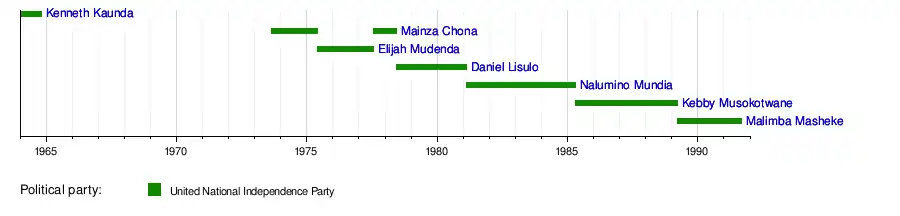 Upon independence and the renaming of the country as Zambia, Kaunda became the new president of Zambia after being elected unopposed.[4][5] The office of prime minister was abolished accordingly.[6] In 1973, following an amendment to the Constitution of Zambia, the office of prime minister was re-established as the titular head of the government but the holder would be subordinate to the Secretary-General of UNIP in governing Zambia.[7] This was because the Central Committee of UNIP had precedence over the Parliament of Zambia under the Constitution.[8] President Kaunda appointed his former vice-president, Mainza Chona, as prime minister.[9] In 1975, Chona resigned and was replaced by Elijah Mudenda.[10] In 1977, Chona became prime minister again for a year before the role was taken over by Daniel Lisulo.[11] Kebby Musokotwane took the role over from Nalumino Mundia in 1985, becoming the youngest prime minister and also the first that was not a member of UNIP's Central Committee.[8] He was removed in 1989 and given an overseas diplomatic post due to President Kaunda believing he was aiming to become the next president.[12]