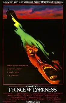 Prince of Darkness is a 1987 American supernatural horror film, written and directed by John Carpenter, and starring Donald Pleasence, Victor Wong, Jameson Parker, and Lisa Blount. The second installment in what Carpenter calls his "Apocalypse Trilogy"—which began with The Thing (1982) and concludes with In the Mouth of Madness (1994)[2]—the film follows a group of quantum physics students in Los Angeles who are asked to assist a Catholic priest in investigating an ancient cylinder of liquid discovered in a monastery, which they come to find is a sentient, liquid embodiment of the son of Satan.