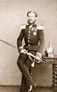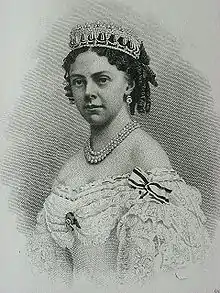 Furthermore, William had a reputation for drunkenness and a dissolute character, so it was surprising that the exceedingly pious and recently widowed Queen Elisabeth gave her consent to the match.[1] On two occasions William had been deprived of his command in the Prussian army and had recently proposed marriage to the celebrated ballerina Marie Taglioni; consequently he was generally considered to be the "black sheep" of the family.[1] Regardless, the Queen granted her permission, endowing her with a grand trousseau of lavish clothing and jewelry.[3] Her other uncle Emperor Wilhelm I gave her an opulent diamond necklace, while her mother Princess Marianne gave her a necklace of Siberian amethysts as well as an emerald diadem.[3]