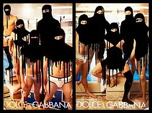 Other works by Princess Hijab include the Lafayette series, depicting a model promoting the French department store Galeries Lafayette, wearing a blue, white and red striped top and a black mask over her mouth, and the Dolche series, a series of Dolce & Gabbana adverts representing male models hijabized by the artist.