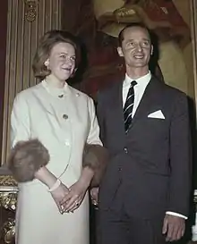 While studying Spanish in Madrid, Irene met then Prince Carlos Hugo of Bourbon-Parma, the eldest son of Carlist claimant to the Spanish throne, Xavier, Duke of Parma and Head of the House of Bourbon-Parma. In the summer of 1963, Princess Irene secretly converted from Protestantism to Roman Catholicism.[12] The first time the public or the royal family knew about the conversion was when a photograph appeared on the front page of an Amsterdam newspaper showing the Princess kneeling to receive communion at a Mass in the Roman Catholic Church of the Hieronymites (Los Jerónimos) in Madrid.[13] Irene's conversion took place a year before her engagement announcement, but the royal family did not officially announce the news until January 1964.[14][15] When news leaked out that she was engaged to Prince Carlos Hugo (born 1930), it provoked a Protestant outcry and a constitutional crisis.[16][17]