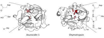 Comparison of Azurocidin 1 structure (pseudoprotease) to Chymotrypsin (functional protease) of same superfamily
