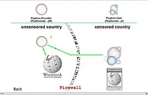 The original concept for Psiphon envisioned an easy-to-use and lightweight Internet proxy, designed to be installed and operated by individual computer users, who would then host private connections for friends and family in countries where the Internet is censored. According to Nart Villeneuve, "The idea is to get (users) to install this on their computer, and then deliver the location of that circumventor, to people in filtered countries by the means they know to be the most secure. What we're trying to build is a network of trust among people who know each other, rather than a large tech network that people can just tap into."[8] Psiphon 1.0 was launched by the Citizen Lab on 1 December 2006 as open-source software.[9]