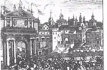 On the site previously stood a gate dating from the Almohad period that was demolished to build the Puerta de Triana in 1588. It was located at the junction of the calles Gravina, Reyes Católicos and Zaragoza. It was the only one walls gate in Seville who had three arches, so it was called "Puerta de Trina" which quickly led to Triana because it is the natural communication with said neighborhood across the bridge puente de Barcas.[1] Outside of Triana when it would expect it to be in the Plaza de Altozano. This gate was well known for its confluence with the calles Santas Patronas, is considered one of the most majestic walls gate existed in Seville for its elegance and height.