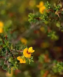 Pultenaea parviflora is usually an erect shrub that typically grows to a height of up to 1.8 m (5 ft 11 in) and has soft hairs pressed against the stems. The leaves are arranged alternately, wedge-shaped to egg-shaped leaves with the narrower end towards the base, 2–6 mm (0.079–0.236 in) long and 1–1.5 mm (0.039–0.059 in) wide with stipules about 2 mm (0.079 in) long at the base. The edges of the leaves curve upwards and the tip is turned downwards. The flowers are arranged in clusters near the ends of branchlets, each flower 5–7 mm (0.20–0.28 in) long on pedicels 1.0–1.5 mm (0.039–0.059 in) long. The sepals are 4–5 mm (0.16–0.20 in) long with linear, papery bracteoles about 4 mm (0.16 in) long attached to the side of the sepal tube. The standard petal is yellow to orange with red markings, the wings yellow to orange and the keel yellow to red. Flowering occurs from August to November and the fruit is an egg-shaped pod about 5 mm (0.20 in) long.[2][3][4]