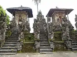 The outer sanctum or jaba pisan is located right beside the main street of the village, basically, it is the street itself. Access to the middle sanctum is provided by a paduraksa gate carved with intricately in northern Balinese style. The paduraksa features monstrous Bhoma head on top of the portal. Beyond the paduraksa gate is the middle sanctum or jaba tengah. The middle sanctum is where several Balinese pavilions (bale) i.e. bale jeroan ("food pavilion") used to prepare cooking for offering and bale gong ("gong pavilion") to keep and perform the gamelan orchestra are situated.[4]