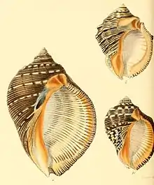 Purpura bufo and 2 shells of Purpura persica (Lovell Augustus Reeve, 1843. Conchologia iconica, or, Illustrations of the shells of molluscous animals)