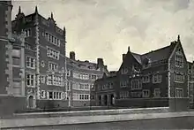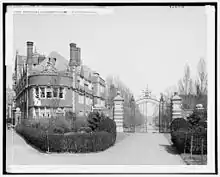 The Quadrangle was the first major dormitory built by the university.[4] Prior to its construction, the undergraduate components of the College (25 to 50 percent of student body) was populated by many commuters from Philadelphia-area residents; students from elsewhere lived in fraternities, Philadelphia relatives or family friends, or found lodgings in off-campus boarding houses, some of which were owned by Penn.[4] The driving force behind building the dormitory was Charles Custis Harrison, heir to a sugar fortune and university provost, 1894–1910. He removed the unofficial campus architect, Frank Furness, replacing him with Cope & Stewardson, who were making a reputation as practitioners of the fashionable Collegiate Gothic style.[7] Walter Cope and John Stewardson had designed exquisitely detailed historicist buildings for Bryn Mawr College beginning in the late-1880s, but the Quadrangle would be a project at a far larger scale and with a much higher level of ornament.[8]