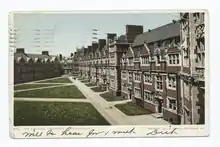 The Quadrangle Dormitories (commonly referred to as Quad) are a complex of 39 conjoined residence houses at the University of Pennsylvania, in Philadelphia, Pennsylvania, United States. The architectural firm of Cope and Stewardson designed the houses in an exuberant Neo-Jacobean version of the Collegiate Gothic style, and completed most of them between 1894 and 1912. The dormitories stretch from 36th to 38th Streets and from Spruce Street to Hamilton Walk (Pine Street). West of the Memorial Tower at 37th Street, the houses on the north side follow the diagonal of Woodland Avenue (now Woodland Walk) and form a long triangle with the houses on the south side. From 1895 to 1971, the dormitories housed only male students.[4]