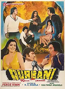 Qurbani (transl.Sacrifice) is a 1980 Indian Hindi-language musical romantic action thriller film produced, directed by and starring Feroz Khan (under the banner of FK International). The film co-stars Vinod Khanna, Zeenat Aman, Amjad Khan, Shakti Kapoor, Aruna Irani, Amrish Puri and Kader Khan.[1] Qurbani was famous for its music, especially the Bollywood disco song "Aap Jaisa Koi" sung by Pakistani popstar Nazia Hassan and produced by Biddu, as well as the song "Laila O Laila".