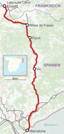 R3 trains use the Meridiana Tunnel in Barcelona, where they share tracks with Barcelona commuter rail service lines R1, R4 and R7, as well as Girona commuter rail service line RG1 and regional rail line R12, calling at Sants, Plaça de Catalunya and Arc de Triomf stations.[2] They run primarily on the Barcelona–Latour-de-Carol-Enveitg railway, using Latour-de-Carol-Enveitg as their northernmost terminus, and L'Hospitalet de Llobregat as its southern one.