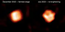 In December of 2022, the star was reported by two astronomers to be going through a "great dimming", reaching a fainter than usual magnitude of 7.6.[15][27][28] It was speculated to be caused by short periods of enhanced mass loss leading to the condensation of dust that partially obscures the stellar photosphere.[8] This was later confirmed by observations with the CHARA array, revealing a dark patch on the western side of the star suggested to be a dust cloud released in a recent surface mass ejection.[11] An unusually bright maximum attained in 2019 right before the dimming was suspected to be caused by an energetic convective upwelling of hot gas, later being expelled and cooling into a dust cloud obscuring the star.[11] The event is compared to the great dimming of Betelgeuse that happened in late 2019[8][11][15][27][28] and the dimming events seen in the historical light curve of VY Canis Majoris.[8][11]