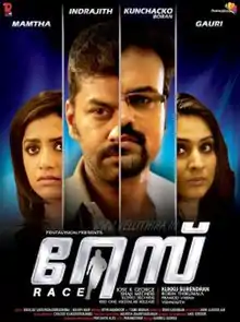Race is a 2011 Malayalam-language thriller film directed by Kukku Surendran and starring Indrajith, Kunchacko Boban, Mamta Mohandas, Baby Anikha, and Gowri Munjal.[1] The story is based on Greg Iles's novel 24 hours.[2][3] The film opened in Kerala theatres on 11 February 2011 to negative reviews.[4] It was dubbed into Telugu as Game by Narne Media Solutions (Pvt) Limited in 2013. It was a remake of the Hindi film Deadline: Sirf 24 Ghante.