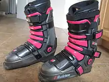 A pair of late-model Flexon Comp ski boots. The cable closures are designed to hold the flex plate (black and pink) firmly against the front of the boot. The plate can be changed to modify the forward flex.