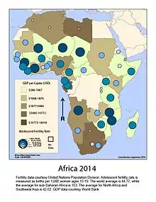 The highest rate of teenage pregnancy in the world—143 per 1,000 girls aged 15–19 years—is in sub-Saharan Africa.[4] Women in Africa, in general, get married at a much younger age than women elsewhere—leading to earlier pregnancies. In Nigeria, according to the Health and Demographic Survey in 1992, 47% of women aged 20–24 were married before 15, and 87% before 18. Also, 53% of those surveyed had given birth to a child before the age of 18.[5] African countries have the highest rates of teenage birth (2002)[6] According to data from World Bank, as of 2015, the highest incidence of births among 15- to 19-year-old girls was in Niger, Mali, Angola, Guinea, and Mozambique.[7] In Mozambique, in 2015, 46% of girls aged 15 to 19 years were already mothers or pregnant, an increase of 9% between results found on the National Demographic Health Survey in 2011 and National Survey on HIV, Malaria and Reproductive Health (IMASIDA) 2015. With the exception of Maputo, the country capital city, all provinces presented an increase in the percentage of early pregnancies. The rates are particularly higher in the northern provinces, namely, Cabo Delgado, Nampula and Niassa with 64.9%, 61.3% and 60%, respectively.[8][9]