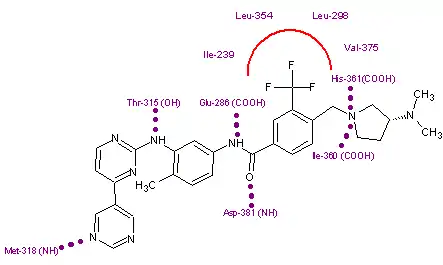 Nilotinib has shown effect against most mutations (32/33) that are associated with imatinib resistance but the T315I mutant remains resistant to nilotinib.[11][12][17] Its ineffectiveness against the T315I mutant seems to be a consequence of the loss of an H-bond interaction between threonine-O and aniline-NH on nilotinib and a steric clash between the isoleucine-methyl group and 2-methylphenyl phenyl group of nilotinib.[11] On the other hand, resistance to nilotinib is associated with a limited spectrum of Bcr-Abl kinase mutations that mostly affect the P-loop and T315I. However all mutations except T315I were effectively suppressed by increasing nilotinib concentration.[17] Although nilotinib is more potent than imatinib it is possible that its specific mode of binding to Abl may make other sites vulnerable to new kinds of drug resistance.[19]