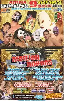 Professional wrestling has been a generational tradition in Lucha libre since its inception early in the 20th century, with a great deal of second or third-generation wrestlers following in the footsteps of their fathers or mothers.[3] Several lucha libre promotions honor those traditions, often with annual tournaments such as Consejo Mundial de Lucha Libre's La Copa Junior.[4] The Naucalpan, State of Mexico based International Wrestling Revolution Group (IWRG) created the IWRG Junior de Juniors Championship in 2011, a championship where only second or third-generation wrestlers are allowed to challenge for it. In addition to legitimate second-generation wrestlers there are a number of wrestlers who are presented as second or third-generation wrestlers, normally masked wrestlers promoted as "Juniors". These wrestlers normally pay a royalty or fee for the use of the name, using the name of an established star to get attention from fans and promoters.[3] Examples of such instances of fictional family relationships include Arturo Beristain, also known as El Hijo del Gladiador ("The Son of El Gladiador) who was not related to the original El Gladiador, or El Hijo de Cien Caras who paid Cien Caras for the rights to use the name.[5][6] Weeks after the creation of the Junior de Juniors Championship IWRG held their first IWRG Rebelión de los Juniors show with the centerpiece of the show being the Junior de Juniors Championship. The Rebelión de los Juniors shows, as well as the majority of the IWRG shows in general, are held in "Arena Naucalpan", owned by the promoters of IWRG and their main arena. The 2013 show was the third year in a row that IWRG used the Rebelión de los Juniors name for a show