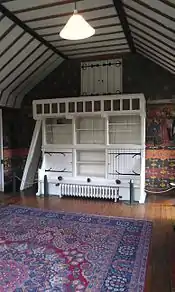 When the building itself had been constructed, Morris set about decorating the interior, however specifically chose to design and create almost everything himself. Only a few pieces of decor were pre-bought as ready-made items, namely the Persian carpets, and blue china or delft.[38] Morris took his painted settle from the Red Lion Square flat and had it transported in pieces to Red House, where it was reassembled in the drawing room.[39] Many other items of furniture were specially designed by Webb, including the oak dining table, other tables, chairs, cupboards, copper candlesticks, fire dogs, and glass tableware.[40] The plastered walls and ceilings were given simple designs in tempera, although more complex designs were planned for the hall and main living rooms.[39] Stained glass windows were installed in the house, with designs created by Burne-Jones and Webb.[41] In reference to the route taken by Medieval pilgrims headed to Canterbury, Morris termed the passage which connects the main hallway to the house's rear entrance, "The Pilgrim's Rest".[42] The garden was similarly unique in its design,[39] with Morris insisting on integration of the design of the house and garden; the latter was divided into four small square gardens by trellises on which roses grew.[43] The flower beds were bordered with lavender and rosemary while lilies and sunflowers had also been planted in the garden.[44] White jasmine, roses, honeysuckle and passion flower were planted to climb up the walls of the house.[45]