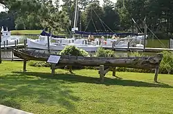 The museum's log canoe, with Claude W. Somers in the background