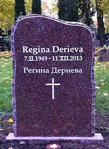 Regina Derieva's funeral took place on December 23, 2013, and she is buried at the Norra Begravningsplatsen (Katolska Kyrkogården) in Stockholm.[3]