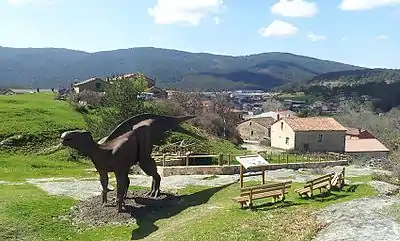 Dinosaur replica placed next to the interpretive table of the El Frontal site in Regumiel de la Sierra