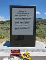 The replica was dedicated on September 25, 2005, with many descendants of the massacre victims and locals in the crowd.[55] During the dedication the stories of the surviving children were told while their descendants placed stones brought from southern Utah upon the cairn.[56] This replica is much smaller in terms of stones than the original, but it does include a large cross facing west, towards Utah, with the words "Vengeance is mine; I will repay, saith the Lord" carved into it. To the side of the replica cairn sits a large interpretative sign with the following inscription: