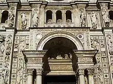 Sometimes a more traditional style continued to be practiced, made up of a decorative exuberance set on Renaissance lines.[10] The main work of this style was the facade of the Certosa di Pavia, which was executed starting in 1491 by Giovanni Antonio Amadeo, who made it to the first cornice, and was completed by Benedetto Briosco. The rather rigid layout, with two overlapping quadrangular bands, is enlivened by vertical pilasters, openings of various shapes, small loggias and, above all, a multitude of reliefs and polychrome marble motifs.[10] Not much differently, Amadeo made for Palazzo Bottigella, where the space between the terracotta architectural lines is (literally) filled with paintings depicting coats of arms, plant motifs, candelabras, fantastic figures and animals.