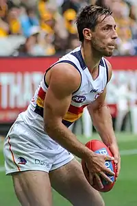 Douglas suffered a potentially serious groin injury in a trial game in the 2014 pre-season, but he surprisingly returned just three weeks later, wearing a cricket box in a match against Port Adelaide and collecting 29 disposals.[7] He missed another two matches early in the season due to suspension after concussing Greater Western Sydney captain Callan Ward with a head-high bump,[8] but he played every match for the remainder of 2014, averaging 22 disposals and starring in his 150th match against Collingwood in round 18.[4] Douglas had his 2015 season interrupted by a foot injury and then appendicitis,[9][10] but performed strongly when fit.[4] In June he signed a new three-year deal with Adelaide, joining teammate Rory Sloane in committing to the club until the end of 2018, and declaring himself as "a Crow for life".[11]