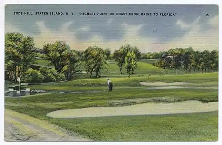 Todt Hill postcard with player on the 3rd green, in front of the 5th green and the 9th green at the "highest point" on top of the hill in the background.