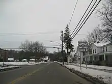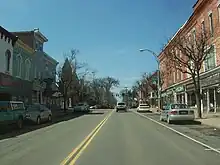 In Wolcott, the path of Ridge Road is known by several names as it traverses the industrial western half of the community—based around a spur of the Ontario Midland Railroad—and its residential eastern portion. It remains West Main Street until New Hartford Street, at which point it becomes just Main Street. One block later, Main Street splits into East Main Street and Mill Street, with Ridge Road following the latter northeast across Wolcott Creek. On the opposite bank of the creek, Mill Street meets Auburn Street, formerly the northernmost part of NY 89,[15] and changes names one last time to Oswego Street. The street leaves Wolcott village on an easterly routing, becoming CR 163 and Ridge Road at the eastern village line.[14]