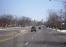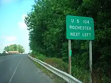 Most of Ridge Road between Lewiston and the city of Rochester 70 miles (113 km) to the east passes through rural, outlying areas of Niagara, Orleans, and western Monroe counties. While NY 31, a parallel highway 5 miles (8 km) to the south, passes through most of the region's largest communities—including the city of Lockport and the villages of Medina, Albion, and Brockport—Ridge Road and NY 104 bypass them entirely. Instead, the two-lane road passes through only small hamlets built up around junctions between NY 104 and other state routes.[5] This changes in central Monroe County, however, where Ridge Road (known locally as West Ridge Road) is six to nine lanes wide[6] as it serves as the backbone of a large commercial district in the town of Greece.[7] Once in Rochester, West Ridge Road enters areas more residential and industrial in nature, including the sprawling Eastman Business Park near the Genesee River.[8]