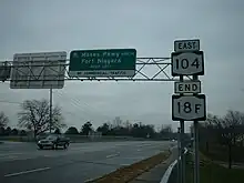 Similar conversion projects were also conducted elsewhere. In Irondequoit, the portion of the Sea Breeze Expressway (now NY 590) from Empire Boulevard to Culver Road opened in the late 1950s. US 104 and NY 18 were extended eastward along East Ridge Road to meet the expressway at what is now exit 11.[40][41] To the southwest, the Keeler Street Expressway was built across Irondequoit in the mid-1960s[15][37] and fully opened to traffic in late 1969.[15][42] US 104 was moved from East Ridge Road to the expressway at that time, while NY 18 remained on East Ridge Road until it was truncated to its current eastern terminus in Rochester c.1973.[39][43] East Ridge Road subsequently became CR 241.[9]