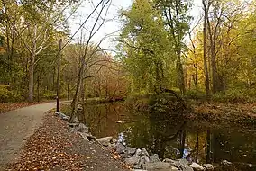 The location of Ridley Creek State Park, just 16 miles (26 km) from downtown Philadelphia, has led to its popularity. Ridley Creek is very popular with fishermen. It is stocked with trout by the Pennsylvania Fish and Boat Commission. A portion of the creek is a designated catch and release area for fly fishing only. There is a wheelchair accessible fishing platform on a multi-use trail. The 12 miles (19 km) of hiking trails at Ridley Creek State Park are popular with dog owners.[10] These trails pass through a variety of habitats. A 5-mile (8 km) multi use trail is open to jogging, bicycling and walking. The park also features a 4.7-mile (7.6 km) equestrian trail.[1][11]