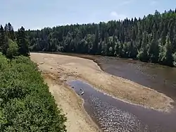 The Sault aux Cochons River has its source in Breault Lake, 9 km (5.6 mi) south of Pipmuacan Reservoir. It then flows in a southwesterly direction and crosses Sault aux Cochons Lake halfway through.[1] It flows over a length of 159 km (99 mi) according to the Commission de toponymie du Québec or of 128 km (80 mi) according to the Organisme des basins versants de la Haute-Côte-Nord to flow into the St. Lawrence River at Forestville.[1][2] The fifteen kilometer downstream of Sault aux Cochons Lake is encased in a canyon.[3] The area of its watershed is 1,946 km2 (751 sq mi).[4]