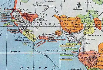 In 1865 the fort at Boké was built in the Rio Nunez area, expanding from the main French-controlled town of Conakry. Shortly after this, Bayol was taken as a 'protectorate' as well. The Rio Pongo area, nominally held by Germany, was traded to France for their 'rights' to Porto-Seguro and Petit Popo on the Togolese coast.[2] The British formally recognised French control of the area, and the administrative division collecting these possessions was created under the name Rivières du Sud in 1882.