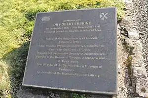 He died at Olonets near St Petersburg on St Andrew's Day, 30 November 1718 and was buried in the Alexander Nevsky Lavra in St Petersburg on 4 February 1719 being granted a full state funeral attended by the tsar.[5] Erskine was a part of masonic network of Scottish Jacobites that influenced the Russian court.[6] A memorial was erected to his memory in Alva churchyard in October 2008.[7]