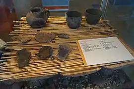 The Rocca di Manerba del Garda was subject to many archaeological excavations which brought to light remains of various prehistoric settlements. In 1955, the announcement of the first proof of prehistoric finds in the area was published. Archaeological excavations in the Sasso area, just below the fortress, revealed traces of a Mesolithic settlement that evidences the presence of human beings about 8000 to 5000 years ago.[3] The area around Sopra Sasso, between the fortification and the lakefront, was the site of a Neolithic Age settlement. It appears possible that fragments of Square Mouth Pottery found on the Rocca di Manerba del Garda are testimony to further activity in the same period.[4] Such as ruins date back to the Lagozza Culture (4000 BC).[5] There is evidence of rituals, cultural and religious activities during the Bronze Age (3000 BC), such as bronze objects. These are evidence of life, even during the Iron Age in the Rocca di Manerba del Garda.[3][6][7] The area of the Rocca is also known for the pile-dwelling sites located by the small basins on the lake. Between 1971 and 1980, a 150 meters long pile-dwelling settlement was found in the area of San Sivino and it is part of the UNESCO heritage site. Further excavations revealed the existence of two housing phases: one between the 20th century and the 17th century B.C. and another one between the 17th century and the 16th century B.C.[8][9] There is also evidence of the rule of the Etruscans.[3]