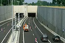 The tunnel is a part of the A73-south highway, connecting the A73-north in Venlo to the A2 near Echt. The tunnel consists of two main tubes, each containing two traffic lanes without shoulders. One tube contains northbound traffic, while the other contains southbound traffic. Additionally, there is a third tube between the two main tubes that functions as an emergency escape route.[1] The maximum speed inside the tunnels is 100 km/h. Since the highway is directly in the path of urban and protected environmental areas in Roermond, the tunnel has been constructed to lead the traffic underneath East Roermond's urban area, the Roerdal environmental protected zone, and the Roer river.