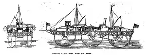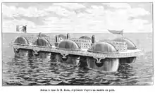 The first and only operational roller ship, the 280-ton Ernest-Bazin, was designed by the French inventor Ernest Bazin after five years of model-based tests and launched at Saint-Denis on August 19, 1896.[3] It had three pairs of discs ten-metres in diameter and three-metres thick; each pair was independently driven by a fifty-horsepower engine and, under normal conditions, about one-third submerged. The main hull was supported just above the axes of these discs, 4m above the sea level, and was about 40 by 12 metres; it contained the engines as well as the crew housing.[4] Bazin predicted the ship would be able to make about eighteen knots, perhaps pushing twenty at full power, but hoped that a ship of similar build with the power that could propel a convention ship to 20 knots could achieve speeds of 47 knots;[5] many observers estimated, however, that the design was theoretically capable of thirty-two knots based on the size and power of the wheels and on early model tests. This compared very favourably with contemporary steamships; the fast ocean liners of the day could manage slightly over twenty knots, whilst high-powered military Torpedo boat destroyers could break thirty.[6] The fuel consumption was also anticipated to be sharply reduced; a full-scale vessel was predicted by Bazin to consume only 800 tons of coal for a thirty-knot Atlantic crossing, compared to 3000–4000 tons for a 22-knot crossing by a conventional liner.[7]