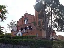 The church has an asymmetric front with a stepped parapet and is constructed of decorative polychrome brickwork in orange and brown. The roof is clad in Roman terracotta tiles. The upper level is accessed by steps to a large terrace at the eastern end. It is cruciform in plan with a long nave and short transepts terminating in small chapels, on the northern side accessing an elaborate scagliola pulpit. Doors on the southern side are accessed by bridges that extend from a raised walkway.[1]