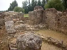 • a Forum and temple, an elevated podium of a temple (17.3 metres by 9 metres) on the extreme southeast, a structure that could have been the foundations of a staircase, as well as similar vestiges of the foundations of a monument;[2]