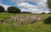 The surrounding agricultural area includes rural structures such as a barn and winery.[2] The granary, which is large and extremely well built, has buttresses distributed along the northern and eastern foundation corridors, indicating a walled courtyard that used natural slab flooring.[2] Also along the southern edge was an area expressly designed for an earth oven to bake bread and an altar in honor of Triborunis (an indigenous divinity).[2]