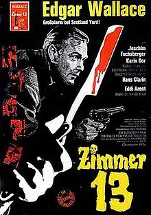 Room 13 (German: Zimmer 13) is a 1964 thriller film directed by Harald Reinl and starring Joachim Fuchsberger, Karin Dor and Richard Häussler.[1] It was made as a co-production between West Germany, France and Denmark, based on the 1924 novel Room 13 by Edgar Wallace. It was part of a long-running German series of Wallace adaptations made by Rialto Film.