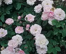 Rosa 'Blush Noisette' is a light pink Noisette rose introduced by Phillipe Noisette (Charleston, South Carolina) around 1815. It was one of the first Noisette roses, and over time has been called by a multitude of names, including Rosa × noisettiana, 'Rosier de Philippe Noisette', 'Noisette de l'Inde,[3] 'Blush Cluster',[4] or 'Noisette Carnée' (French for Flesh-coloured Noisette). According to the RHS Encyclopedia of Roses, the cultivar is mostly called 'Blush Noisette' in America, and otherwise known as 'Noisette Carnée'.[5] 'Blush Noisette' arose as a seedling from the light pink rose hybrid 'Champney's Pink Cluster', introduced by Champneys around 1811 (synonym 'Champneyana'),[6] and was the first frost-hardy climber flowering repeatedly, giving the cultivar importance as a parent rose.