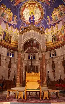 The main altar is carved from black Marquina Florido marble, imported from Spain, and, before the renovation, was covered with an oak baldachin supported by marble columns. The pulpit is carved from white oak by German artisan August Schmidt. Around the apse are statues of the eight authors of the New Testament. Each statue stands under a carved flèche.[2][3]