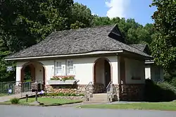 The Roselawn Memorial Park Gatehouse is a historic cemetery office building in Roselawn Memorial Park, a large public cemetery at 2801 Asher Avenue in Little Rock, Arkansas. It stands just inside and to the left of the main gate. It is a single story building, with a gable-on-hip roof, stuccoed walls, and a foundation whose exterior is finished in rough cobblestone. At either end of its main facade are two arches, lined with red brick, providing access to the recessed building entrances. Similar arches on the side walls give the recess a porch-like feel. The building was designed by Thompson and Harding, and built in 1924. It is the only known gatehouse design of firms associated with Arkansas architect Charles L. Thompson.[2]