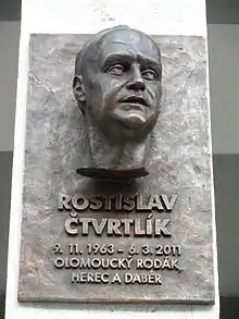 Memorial plaque and a bust of Rostislav Čtvrtlík in Olomouc, the Czech Republic. The bust was made by Zdeněk Manina in 2012. There is written on the plaque in Czech:
