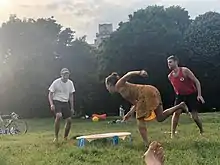 Roundnet features elements from sports such as volleyball and four square.[5] The game is played between two teams of two (or sometimes 3) people.[6] For 2v2 games, players are positioned at 4 points around the net, with partners located at neighboring positions. For 3v3 games, players are positioned at 6 points around the net, with members from each team alternating positions so that each team is in a triangle formation.[7] One player serves the ball directly across the net to the opposing team member. The opposing team then has 3 (4 if it is a 3v3 game) hits to return the ball to the net.[6] After the serve, there are no boundaries of play. Participants are free to run, set, and spike the ball from anywhere around the net. Play continues until a team fails to return the ball or the ball hits a rim piece, at which point the point ends, and the other team receives 1 point.[6][7]