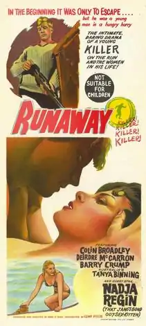 Runaway, also called Runaway Killer, is a 1964 New Zealand made thriller film and a road movie. John O’Shea of Pacific Films produced, directed and co-wrote it. Shot in black and white and released on 35 mm and also 16 mm, it was cut to 80 minutes and renamed Runaway Killer for release in Britain, although this lost continuity between scenes. The film stars Colin Broadley in the lead, and several New Zealanders who became famous in other fields; Kiri Te Kanawa, Barry Crump and Ray Columbus.