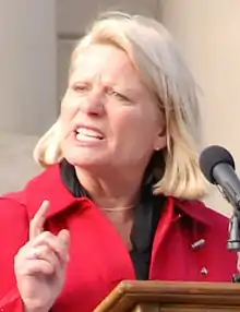 Johnson, of Holly, was a former public school teacher, small business owner, and public official in a suburban area immediately north of Detroit with a population of more than one million, prior to her election as secretary of state in November 2010.[2][3][4] She was elected to the Oakland County Board of Commissioners in 1988 and served for 10 years. Johnson was elected to the Michigan House of Representatives in 1998, and re-elected in 2000 and 2002; term limits meant she was ineligible for a fourth term.[5] She was elected Oakland County Clerk and Register of Deeds in 2004, upsetting incumbent G. William Caddell in the Republican Primary[6] and defeated Democratic nominee Jason Ellenburg in the general election.[7] She became the first woman clerk in Oakland County's 176-year history.[4] Johnson became popular for her community outreach event and parties.